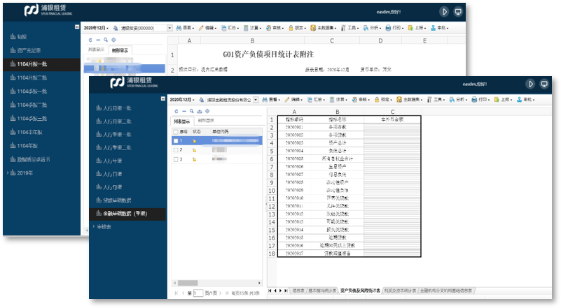 浦銀租賃大數(shù)據(jù)服務平臺一共建設了183張報表,涵蓋日常工作報表、財務報表、監(jiān)管報送、1104報表、人行報表、總行報表、EAST報表等,滿足公司領導、資產部門、財務部等各部門人員多樣化的數(shù)據(jù)分析需求。幫助高管快速掌握公司的運營情況,精細化管理;讓業(yè)務人員自助拖拽報表,釋放實施人員精力,為業(yè)務人員提供工作便利,提高工作效率;支持監(jiān)管報表的填報、審核、上報、匯總等工作,滿足監(jiān)管報表的定時報送要求。