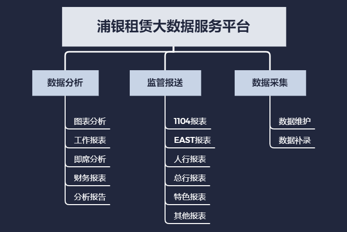 基于監(jiān)管報表生成質量無法得到有效保證、內外部數(shù)據(jù)的統(tǒng)計分析工作成為日常辦公基本需要、各部門對數(shù)據(jù)服務提出較高要求等問題,浦銀租賃大數(shù)據(jù)服務平臺總體設計分為數(shù)據(jù)分析、監(jiān)管報送和數(shù)據(jù)采集三大模塊。