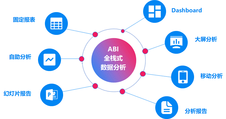 多終端無縫應用,不同移動設備自適應,一表三屏;在線離線兩種瀏覽模式,脫機也能隨時隨地訪問移動數據;多種集成、接口技術,可靈活將移動分析表、移動填報表集成到第三方app中。 輕松應對各類人員分析需求 全角色 有了ABI一站式數據分析平臺,可謂是一個平臺搞定所有人的需求。既可以為實施人員提供面向數據倉庫的數據分析展現,也可以為業務人員提供自助式數據分析能力,還可以讓開發人員靈活實現個性化功能擴展。 對于開發人員來說,ABI有上千個API接口,可以靈活實現個性化功能擴展,縮短項目實施周期,降低成本。 對于實施人員來說,技術門檻低,可以零腳本制作報表。 對于數倉人員來說,無需編寫sql,圖形化界面快速完成數倉建設。 對于管理人員來說,需要充分了解公司運營概況,通過KPI報表可以隨時隨地獲取企業關鍵數據信息,真正做到了然于心、謀定而動。 對于業務人員來說,可通過自助分析完成求證式、猜想式分析以及圖表分析,發現數據價值。 對于運維人員來說,可視化維護系統穩定,提升工作效果。   不負眾望,一站式數據分析平臺ABI交互體驗更棒,視覺呈現更炫,快來和我們一起見證ABI的成長!