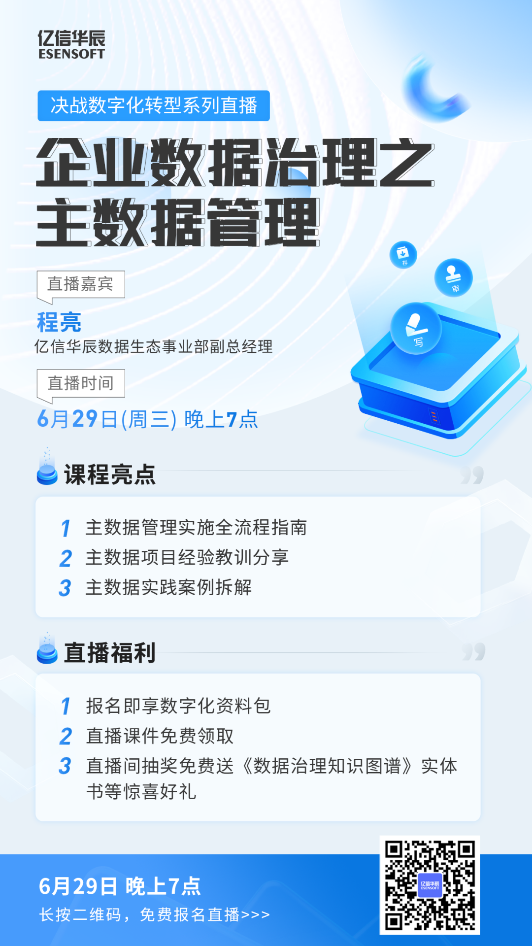 后疫情時代,轉型、升級、提質增效成為幾乎所有企業決策者都在關心的話題。尤其是在國家“十四五”數字經濟發展規劃公布之后,向“數字化”轉型,已成為我國經濟發展的大趨勢,也成為了企業發展的必經之路。 數字化轉型究竟應該如何轉?企業決策者可以從哪些實際工作層面著手搭建企業的數字化?又有哪些典型行業應用案例可供參考?億信華辰深耕政企大數據領域16年,作為國內領先的數據治理和數據分析產品與服務提供商,精心籌辦“決戰數字化轉型”系列直播,旨在從思路、工具、實踐多個角度,分享如何通過數字化手段實現轉型升級。 6月29日-8月3日,六周時間,每周三晚上19:00-20:30,為大家帶來精彩的直播干貨分享,內容包括: 多領域:主數據、數據資產、指標管理、數據治理…… 多視角:趨勢、路徑、場景、案例、方法論…… 更有直播福利可以領取哦,觀看直播有機會獲得行業火爆的《數據治理知識圖譜》、《數據治理精選案例集》;并且全場直播PPT、視頻都將對外開放。   直播課程特色 1、聚焦轉型熱點,分享前沿理念 融合數百家大型企業數字化轉型實踐經驗,提煉數字化轉型方法論及實踐路徑,億信華辰咨詢團隊大拿授課。 2聚焦標桿典范,剖析最佳實踐 通過案例解讀,從主數據、數據資產、指標管理、監控報送、統計上報等不同維度剖析數字化轉型痛點、難點與最佳實踐。 直播課程安排
