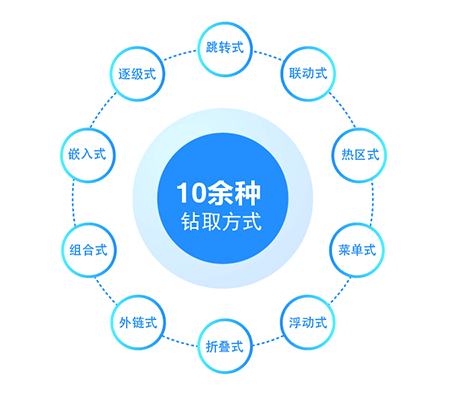 提供了十余種鉆取方式,并采用向導式的定義,鉆取方式包括:逐級式、跳轉式、聯(lián)動式、熱區(qū)式、菜單式、浮動式、折疊式、外鏈式、組合式、嵌入式等。