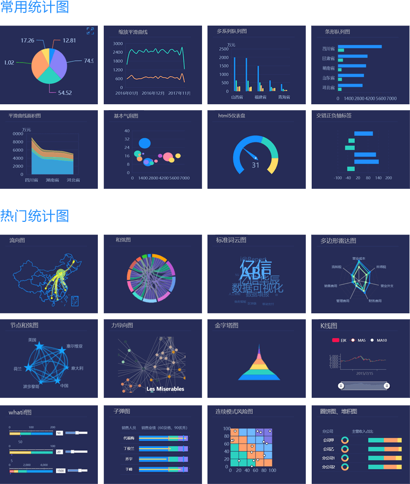ABI采用JS、FLASH、HTML5三種技術自主開發統計圖,豐富的統計圖保證了其具有美觀的圖形展現能力,除了常用的柱狀圖、線狀圖、條形圖、面積圖、餅圖、點圖、儀表盤、走勢圖外,還支持和弦圖、圈餅圖、金字塔、漏斗圖、K線圖、關系圖、網絡圖、玫瑰圖、帕累托圖、數學公式圖、預測曲線圖、正態分布圖、迷你圖等,樣式包括2D、3D、EXCEL、AUTUMN、FLASH等;通過組合設計可以搭配處上千種視覺效果。