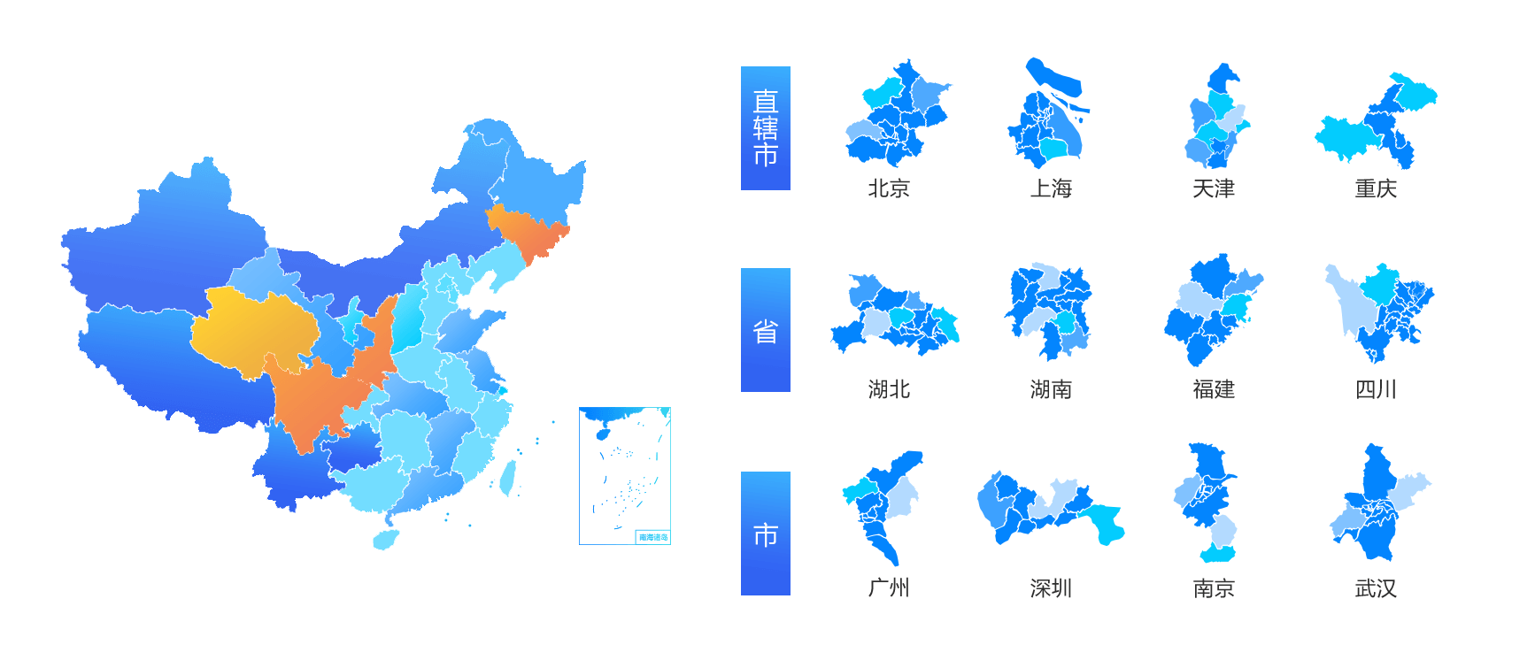 內置五大洲及世界地圖、中國地圖,囊括中國34個省239個市區縣的地圖,地圖類型包塊FLASH、圖片和HTML5格式,同時支持個性化定制地圖。