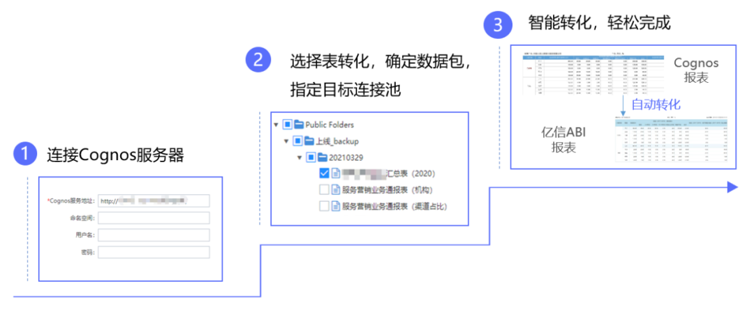 為解決重復(fù)做表與建模問題,通過億信華辰獨(dú)家技術(shù)實(shí)現(xiàn)Cognos報表的批量轉(zhuǎn)換、自動轉(zhuǎn)換,只需三步完成Cognos報表到億信ABI報表的轉(zhuǎn)換,全程只需幾分鐘。